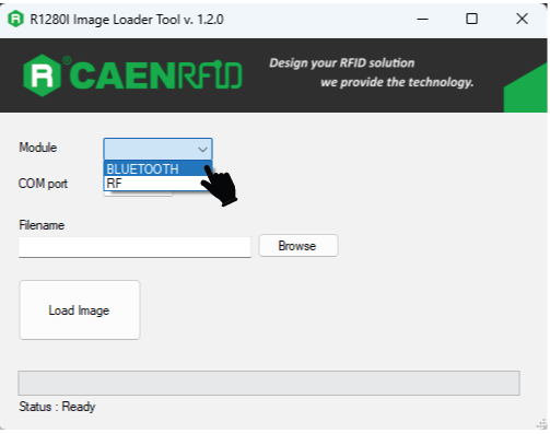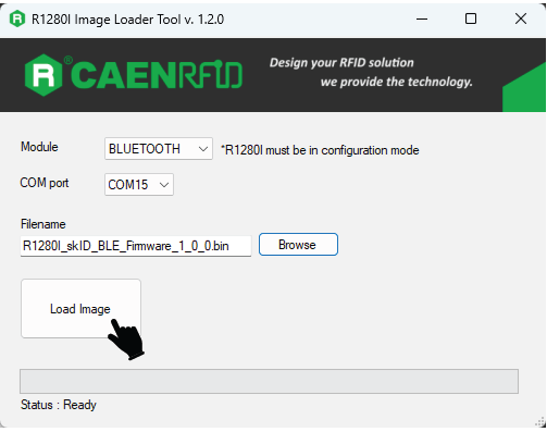 To change the Bluetooth mode from BT to BLE, same steps are to be followed as mentioned above, only the R1280I_skID_BLE_firmware.bin file is to be used instead of R1280I_skID_BT_firmware.bin