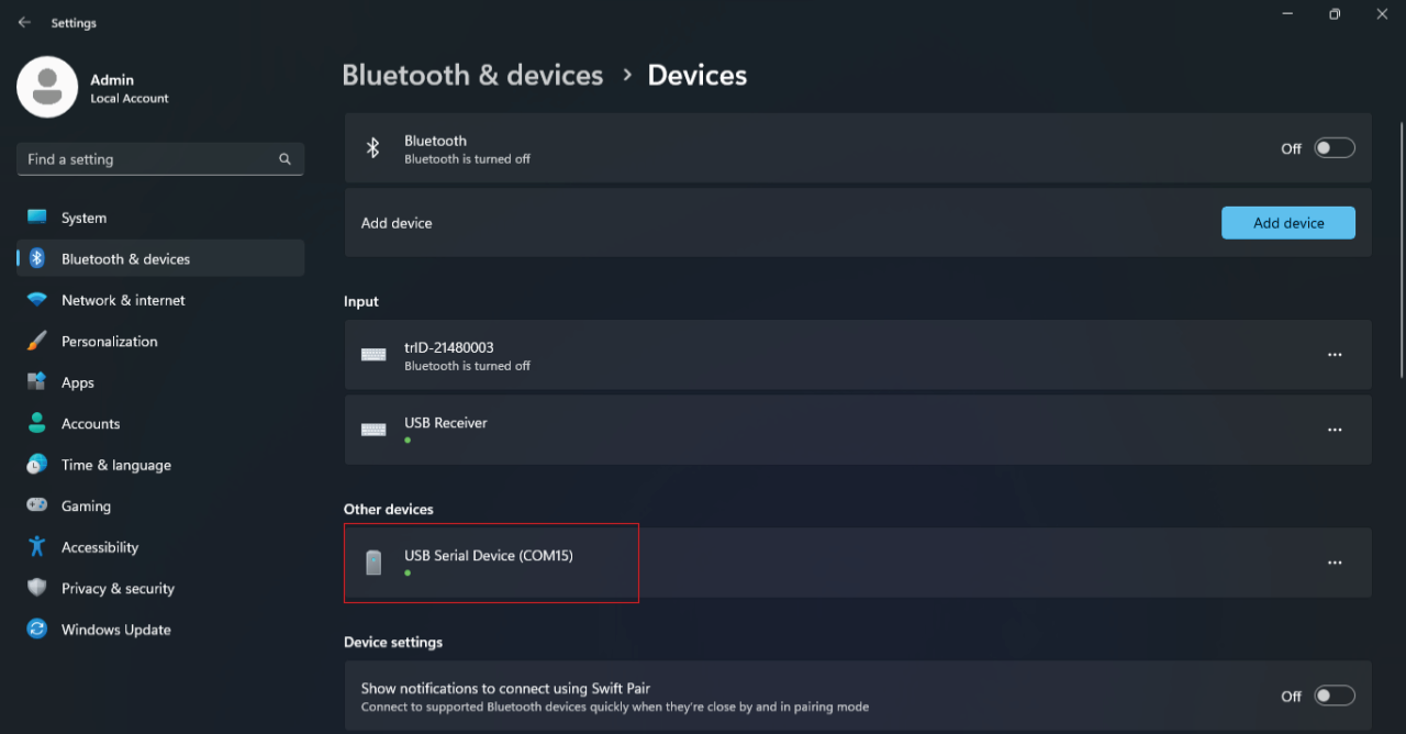 7. To find the COM port In your Windows PC on which skID Device is connected, go to Settings → Devices, you will see the COM Port Number as shown in the image below.