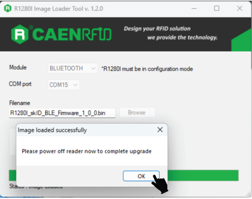 13. On successful loading, an acknowledgment/popup window will appear – stating that “Image loaded successfully” and “power off the reader now to complete upgrade”.