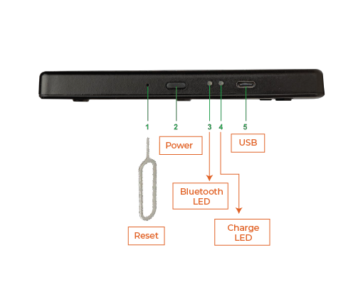3. Insert and hold down the tip of the SIM Card Tray Eject into the reset hole and then press the power button (1sec) to power on the device. Release the power button and extract the SIM Card Tray Eject: the reader beeps and the Bluetooth LED should turn green.