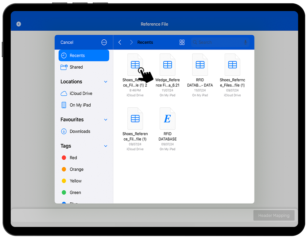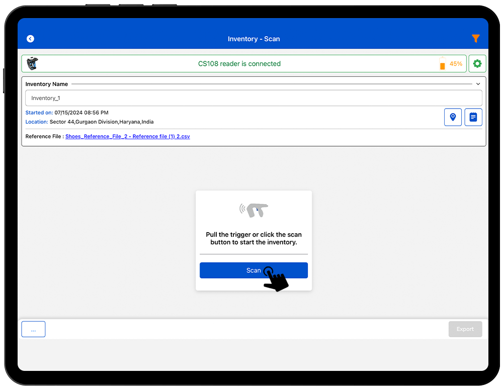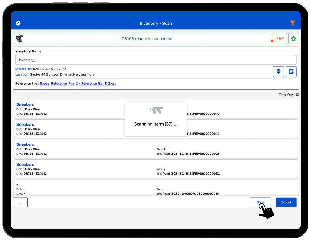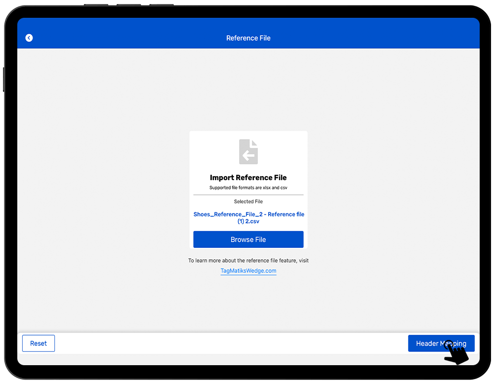 The Reference file feature is a csv or xlsx file containing all the necessary information which needs to be displayed at the time of inventory or exporting report of the inventory. Common examples in the retail sector are GTIN/UAN, EPC, Color, Size, SKU, Expiry Date, PO Number, Manufacturer etc.