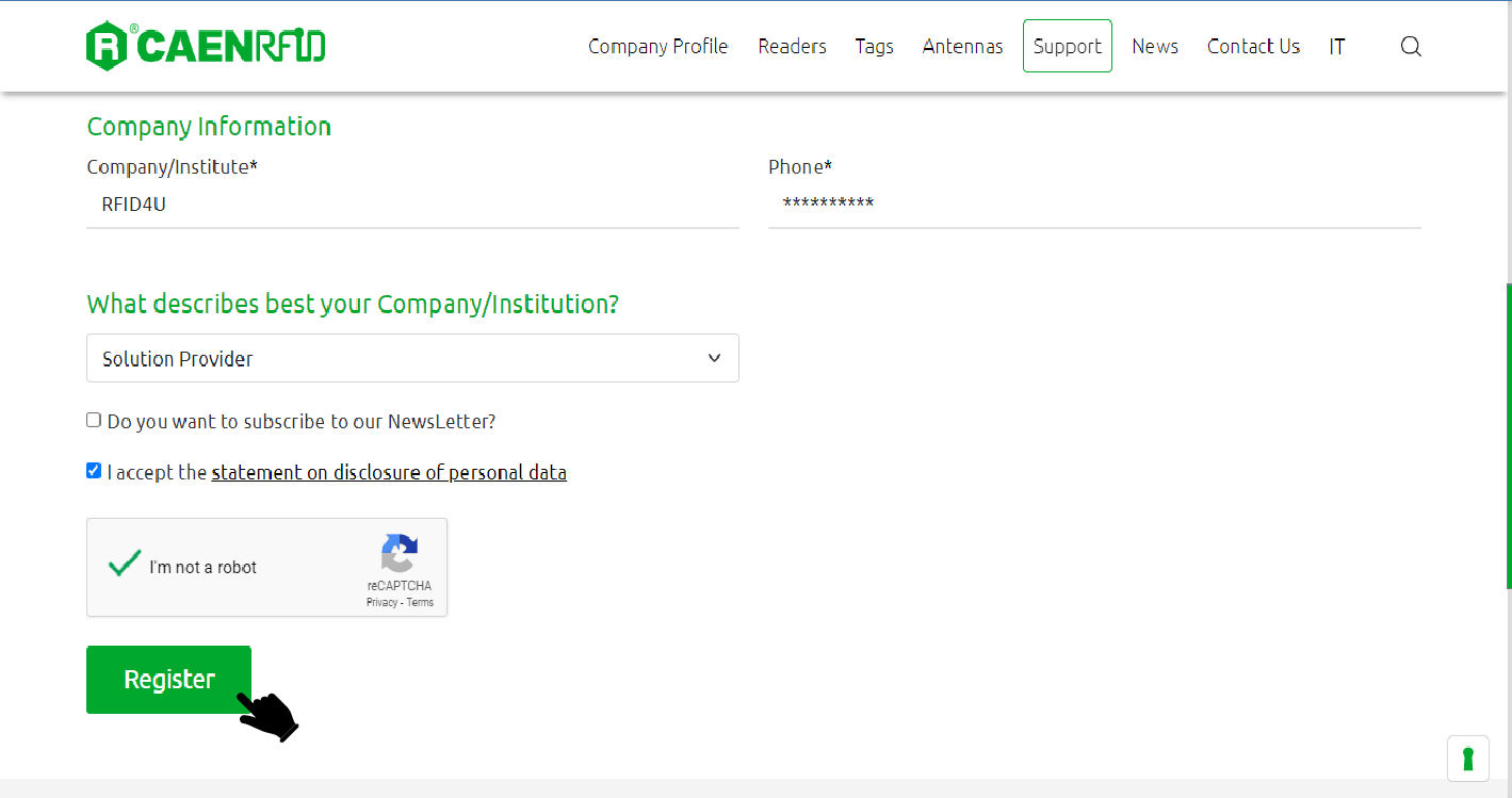 6. If you are new to the CAEN website fill out the registration form and click on the “Register” button as illustrated in the picture below: