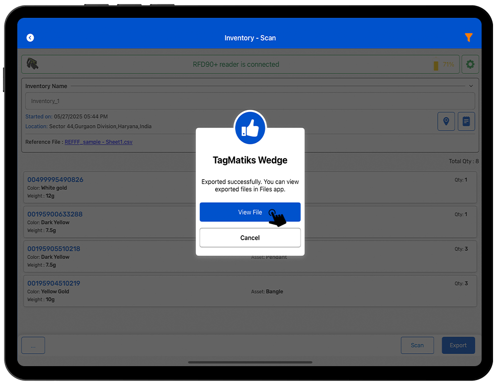 5. After Allowing TagMatiks wedge for Export file, then it will Export the file and show a message on TagMatiks Wedge Application :- Export Completed . As shown in Fig 3.6.