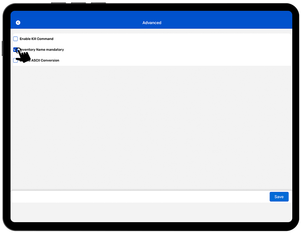 6. You can Tap on the Check Box to make the Inventory Name Mandatory as shown in the image below and tap on Save. As shown in Fig 1.3.