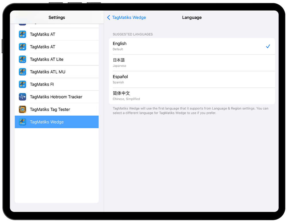 Option2 (iOS Version 13 and above): Please go the Settings -> Select TagMatiks Wedge application and click the Preferred Language option and then choose your desired language