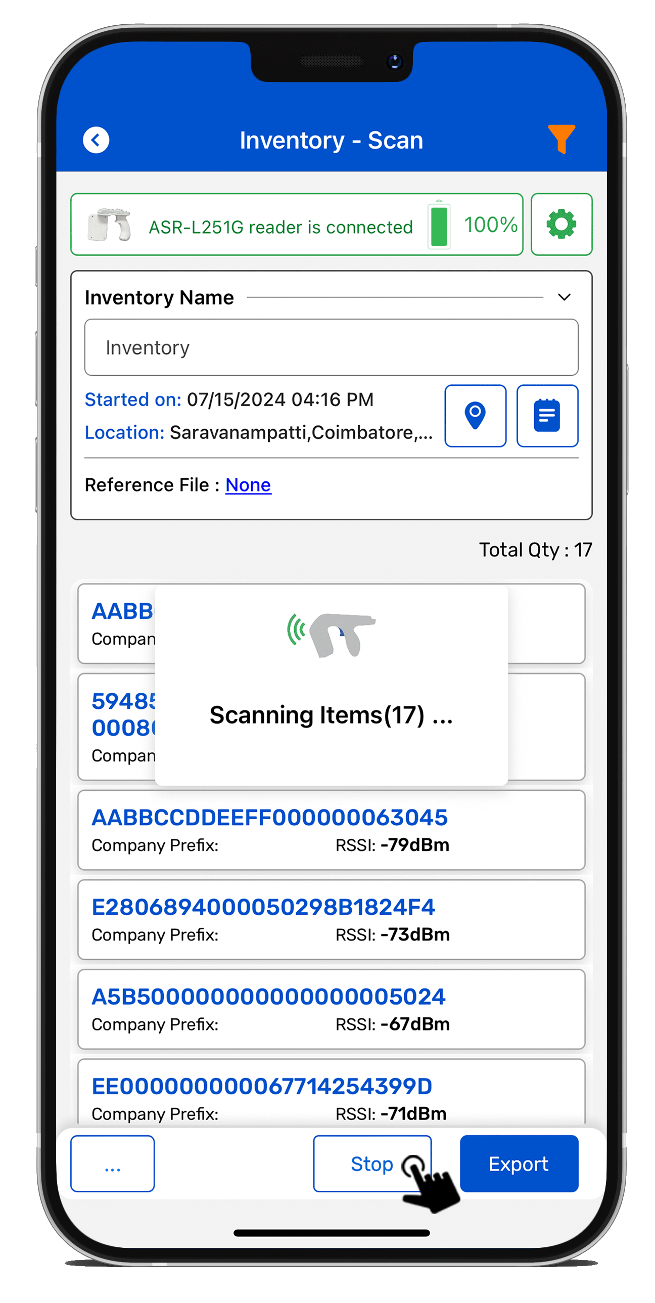 5.Once you press the “Stop” button (on the right bottom of the application); ASR-L251G reader will stop reading the tags.As a result, the read tags will populate on the application window, as shown in below image.As shown in Fig 0.8.