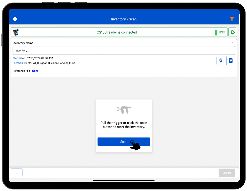 1. To read the RFID tags from CS108 reader; Click on “Inventory” button option, from Home Page. As shown in Fig 0.6.