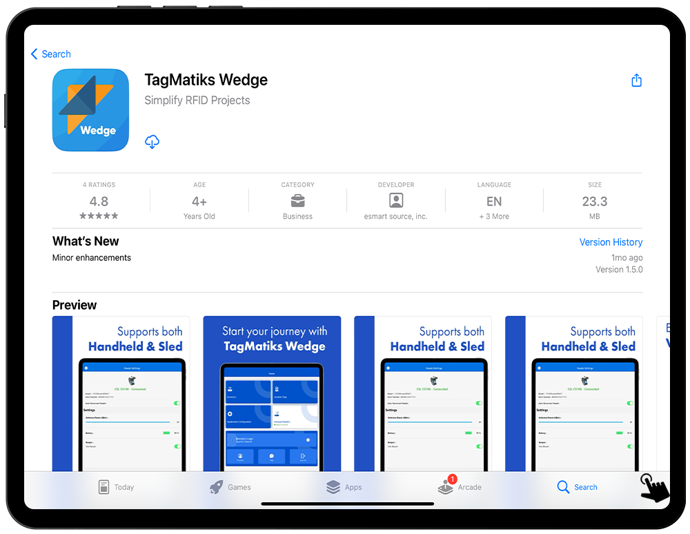 TagMatiks Wedge App can be downloaded from the App Store by using the link below from an iOS device. You can use up to 500 scans at no cost per RFID device.