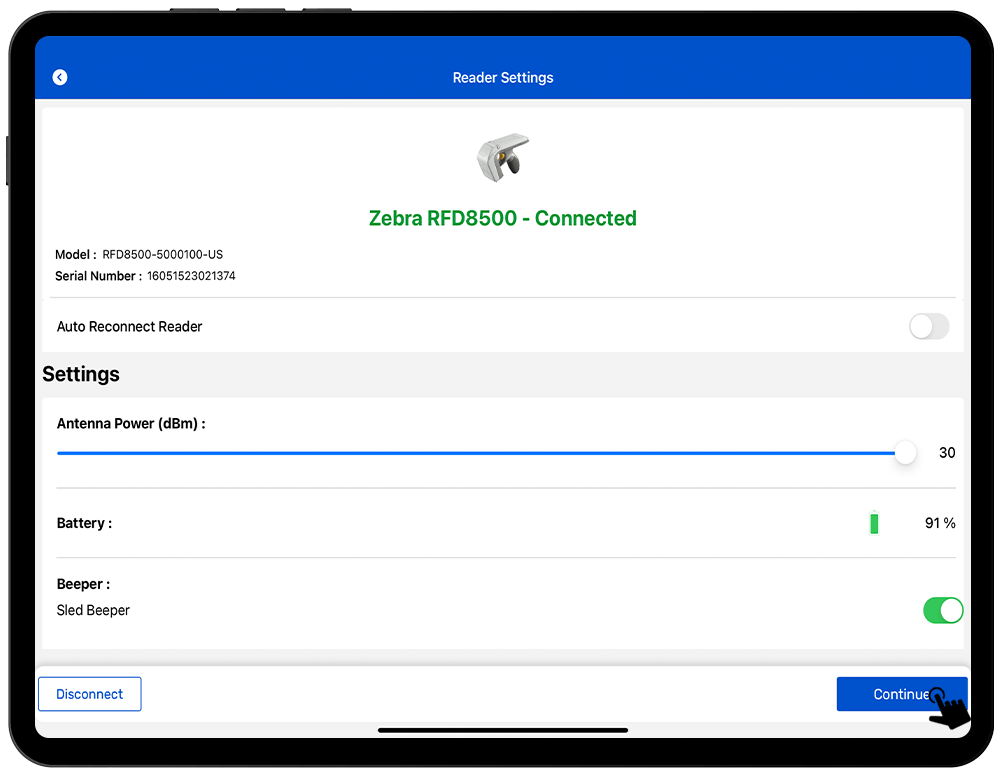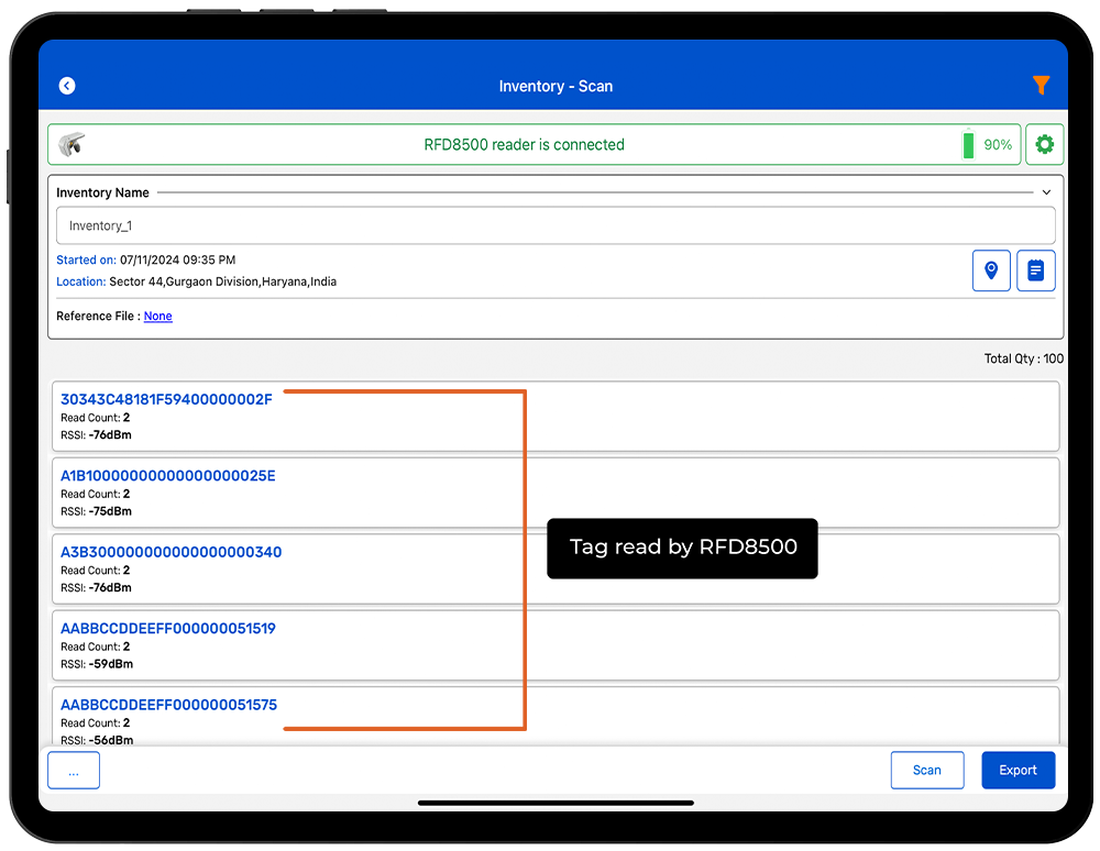 C.RFID tags are scanned using the Zebra RFD8500 reader.