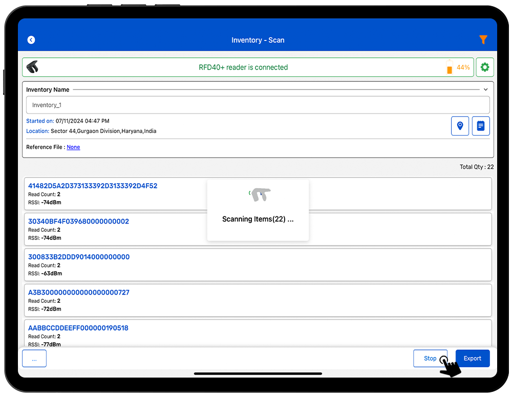 5.Once you press the “Stop” button (on the right bottom of the application); reader will stop reading the tags.