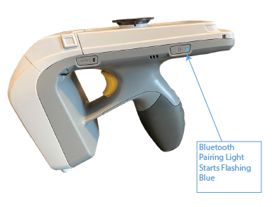 When the RFD8500 device is powered on, the “Bluetooth Pairing” LED light will automatically start flashing Blue – this indicates that the RFD8500 device is now in discoverable mode and ready to pair with a nearby IOS device.